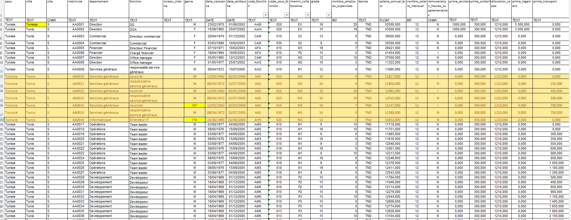 À partir du fichier "Descriptif champs - HR House International" (document de référence pour l’implémentation de la compensation), appliquer strictement les règles de validation définies. Lors de l'importation, seuls les enregistrements conformes aux règles doivent être acceptés. Les enregistrements non valides doivent être rejetés et consignés dans un fichier de retour contenant le détail de chaque champ rejeté ainsi que la raison du rejet.