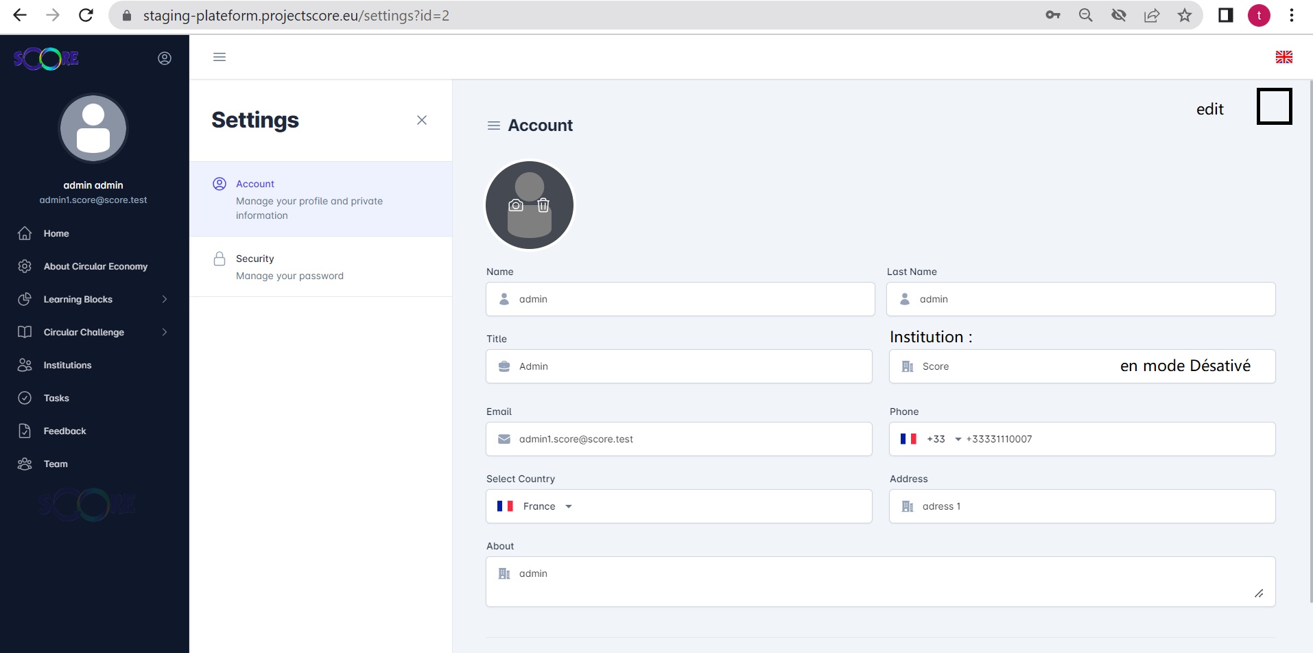 EN tat que admin, lorsque je clique sur mon profil : le champ instituation est désactivé.